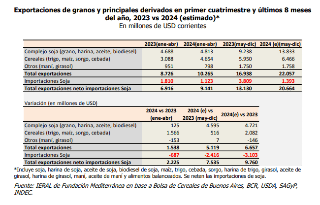 Según un informe redactado por Franco Artusso y Tobías Lucero, investigadores del Ieral de la Fundación Mediterránea, para 2024 se estiman exportaciones brutas y netas de productos agroindustriales por U$S 32.300 millones y U$S 29.800 millones, respectivamente, a lo largo de todo 2024.