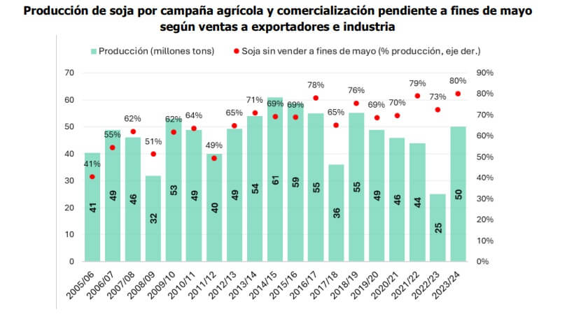 En soja, calcularon que hasta finales de mayo los productores vendieron cerca del 20% de las 50 millones de toneladas proyectadas para el ciclo 2023/24.