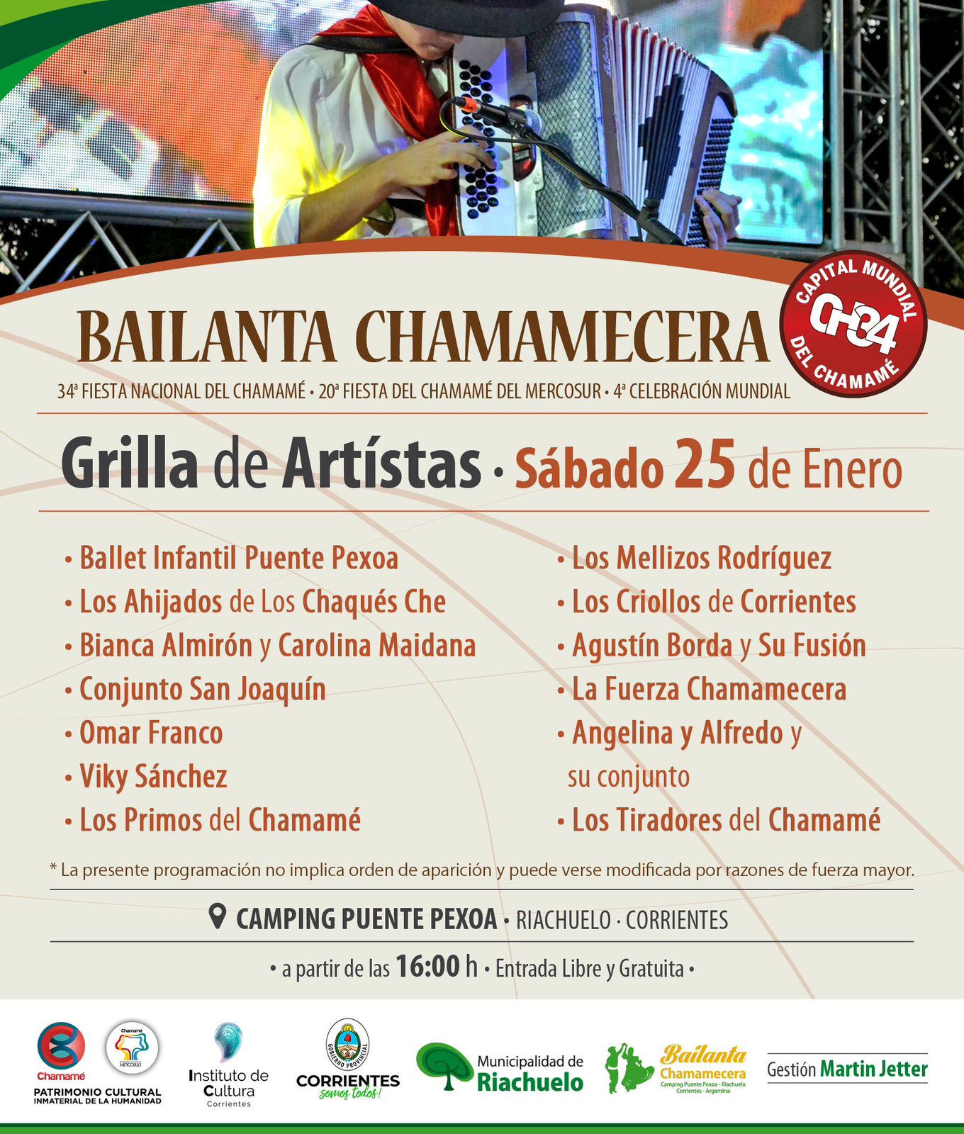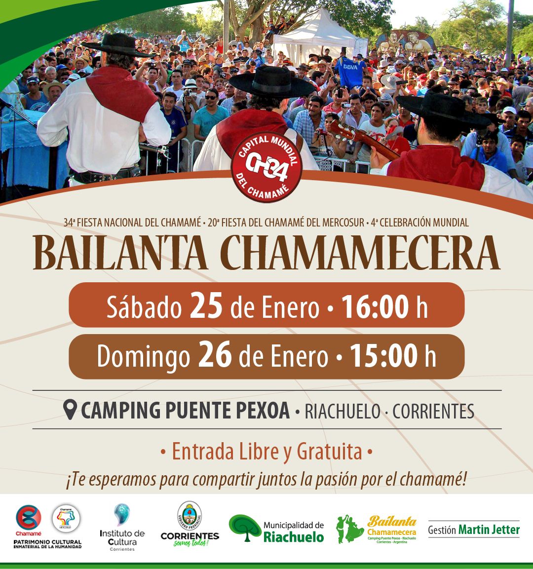 Eventos y ActualizaciónInstitucionalesBAILANTA CHAMAMECERA CAMPING PUENTE PEXOA Riachuelo-Corrientes Nordeste Agropecuario9 meses atrás9 meses atrás01 mins minutos Tiempo de lectura aprox: 2 segundos 34° FIESTA NACIONAL DEL CHAMAMÉ- 20° FIESTA DEL CHAMAMÉ DEL MERCOSUR- 4° CELEBRACIÓN MUNDIAL About The Author Nordeste Agropecuario See author's posts Navegación de entradas Anterior: CHACO: “Las pasturas están como si les hubieran tirado con lanzallamas”.Siguiente: El Gobierno anunció que bajará las retenciones al campo y que se eliminarán para las economías regionales Deja una respuesta Cancelar la respuestaTu dirección de correo electrónico no será publicada. Los campos obligatorios están marcados con *Comentario * Nombre * Correo electrónico * Web