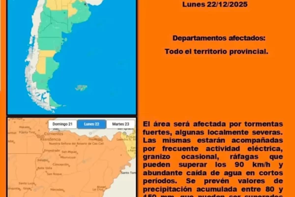 Tiempo de lectura aprox: 20 segundosEl Comité Operativo de Emergencias (COE) dependiente del Gobierno de Corrientes, emitió un Alerta Naranja “por tormenta” para la mañana de este lunes. Según el informe, afectará a todo el territorio provincial. Según las previsiones del Servicio Meteorológico Nacional (SMN), el área se verá afectada por tormentas fuertes, algunas localmente severas. Las mismas estarán acompañadas por frecuente actividad eléctrica, granizo ocasional, ráfagas que pueden superar los 90 kilómetros por hora y abundante caída de agua en cortos períodos. Se pronostican valores de precipitación acumulada entre 80 y 150 milímetros, que pueden ser superados en forma puntual. Fuente: DIP
