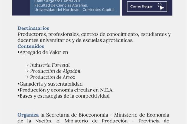 Tiempo de lectura aprox: 3 minutos, 17 segundosSE REALIZA EN LA FACULTAD DE CIENCIAS AGRARIAS En la sede de la Facultad de Ciencias Agrarias de la Universidad del Nordeste (UNNE) se llevó a cabo esta mañana la apertura del Segundo Seminario Regional Cocrear Bioeconomía en el NEA, ciclo formativo dirigido a profesionales, estudiantes, docentes, escuelas agrotécnicas y centros de conocimiento, entre otros. Este evento, impulsado por la Secretaría de Bioeconomía de la Nación, junto al Gobierno de Corrientes y la Universidad Nacional del Nordeste, tiene como objetivo instalar una agenda para el desarrollo local, centrado en la transformación de biomasa, el conocimiento aplicado, el agregado de valor en origen y el cuidado ambiental. En la misma línea, busca destacar y poner en valor los fundamentos productivos que diferencian características de los productos regionales. Así también, dar a conocer los emprendimientos de la región para compartir e intercambiar casos exitosos y experiencias que generan la base de la competitividad regional. Ministro Anselmo Al tomar la palabra, el ministro de Producción, Claudio Anselmo, dio la bienvenida al Seminario y trajo el saludo cordial del gobernador Gustavo Valdés, que por razones de agenda no pudo estar presente. «Cuando hablamos de Bioeconomía, hablamos de producción sustentable de bienes y servicios a partir de recursos biológicos», inició su alocución el titular de Producción. En este marco, Anselmo destacó que «los productores agropecuarios venimos haciendo bien las cosas hace cientos de años, y esto se puede ver en ejemplos concretos de la ganadería, producción de arroz y actividades integradas, como la forestal, la producción de yerba mate y té». «Esto nos distingue como líderes en la producción», expresó el funcionario, en relación a los sectores productivos de la provincia. En otro orden de temas, el ministro resaltó, en la oportunidad, el concepto de producción sustentable, «algo que se desarrolla en Corrientes y en el NEA y de lo que podemos estar orgullosos», ya que «cada día podemos ampliarlo más y facilitar el acceso de todos nuestros bienes y servicios al mercado internacional». «Hoy es claro que cuando uno quiere exportar, lo primero que exigen los compradores del mundo son las garantías: en qué condiciones fueron realizados esos productos, esos bienes, y eso se logra a través del sistema de trazabilidad y certificación», añadió el mismo. Cerrando su discurso, Anselmo concluyó que «la Bioeconomía es la integración entre distintas cadenas y actividades de bienes, productos y servicios que son de calidad, que agregan valor y que son sustentables para el consumo de los seres humanos». Nicolás Bronzovich Por su parte, el director nacional de Agricultura, Nicolás Bronzovich dijo que este encuentro tiene como finalidad impulsar la bioeconomía como motor del desarrollo local, con sectores que utilizan procesos biológicos para producir bienes y servicios, como por ejemplo aprovechando la biomasa y la biodiversidad de manera sustentable. «Esta agenda implica convergencia, exige un abordaje en red y mejorar de manera continua», se expresó al respecto. Vicerrector de la UNNE «Este es un espacio de intercambio y aprendizaje, donde podemos explorar oportunidades y desafíos que la Bioeconomía nos presenta en nuestra región», señaló el vicerrector de la UNNE, José Leandro Basterra, en referencia a la puesta en marcha del 2° Seminario Regional Cocrear Bioeconomía en el NEA. Basterra añadió que «desde la Universidad tenemos a la Bioeconomía como una propuesta innovadora y sostenible para el desarrollo económico, basado en el aprovechamiento de los recursos biológicos, de manera respetuosa con nuestro medio ambiente». En otro orden de temas, el mismo catedrático dio cuenta de la importancia de «pensar en un modelo emergente que se propone el uso de la biomasa disponible», teniendo en cuenta las fortalezas del sector productivo local. Mario Urbani A su turno, el decano de la facultad de Ciencias Agrarias, Mario Urbani, en su carácter de anfitrión, agradeció la presencia de todos y resaltó el interés de la Secretaría de Bioeconomía de la Nación al asistir a Corrientes para acompañar el importante evento. «Sabemos la importancia social que representa esta actividad agropecuaria y todo lo conlleva», manifestó y anheló que la jornada sea provechosa para todos. Abordaje integral de la bioeconomía Es importante destacar que en estos espacios formativos de construcción conjunta de la bioeconomía se busca contribuir al intercambio de saberes, a la adquisición de conocimiento, innovación, vinculación y desarrollo de negocios. Al mismo tiempo, se promueve un abordaje integral de la bioeconomía, posicionando este modelo como una oportunidad y cambio de paradigma productivo y social. Durante toda la jornada se presentarán los emprendimientos de la región vinculados a la bioeconomía y se generan intercambios entre expositores y participantes. Luego de la apertura se iniciaron los paneles que abordan las siguientes temáticas: Biorrefinerías Forestales, Ganadería y sustentabilidad, Producción de Algodón, Producción y economía circular en el NEA y Bases y estrategias de la competitividad. Después del almuerzo, tendrán lugar las sesiones de fortaleza estratégica de manera simultánea, que se extenderán durante la tarde. En este segundo bloque se abordará el eje de las producciones del sector forestal, ganadero y arrocero. Presencias También participaron de la jornada, el director de Extensión de la Bioeconomía de la Nación, Leonardo Galaburri; la vicepresidenta de INTA, María Beatriz Giraudo; el secretario de Desarrollo Foresto Industrial, Luis María Mestres; el secretario de Agricultura y Ganadería, Noberto Mórtola; subsecretario de Producción, Juan Manuel Pomar; el titular de Producción y Ambiente de la provincia de Formosa, Lucas Rodríguez;