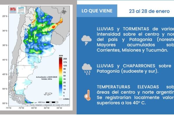 Tiempo de lectura aprox: 1 minutos, 22 segundosLa proyección para el primer trimestre del año realizada por el Servicio Meteorológico Nacional podría significar un mayor riesgo de estrés para zonas que ya vienen complicadas por la falta de agua y los episodios de calor. El Servicio Meteorológico Nacional (SMN) dio a conocer en los últimos días su pronóstico trimestral de lluvias y temperaturas para el primer trimestre del año, que dejó un dato que enciende una luz amarilla para el campo: la posibilidad de que haya episodios de fuertes calores que agraven el estrés de los cultivos. SI bien el horizonte de precipitaciones asoma dentro de los parámetros normales para la época, el problema es que la necesidad de agua de las plantas pueda ser mayor ante una perspectiva de temperaturas superiores al promedio histórico del verano. Esto, en un contexto en el que ya hay zonas claves para la producción agrícola, como el norte de Buenos Aires, donde se están comenzando a ver daños en algunos lotes ante un régimen de lluvias que en diciembre cortó la buena racha que venía arrastrándose desde mediados de la primavera. LAS LLUVIAS DURANTE EL VERANO En concreto, el SMN prevé mayor probabilidad de ocurrencia de precipitación: “Esta previsión debe ser considerada sobre el valor medio del trimestre. Dada la época del año sumado a la baja señal de forzantes de gran escala (El Niño/ La Niña) se espera que continúen predominando las oscilaciones de menor escala (subestacionales y sinópticas), lo cual puede favorecer tanto períodos y/o áreas de eventos de precipitación más intensa que lo normal, como de escasas lluvias”, subraya el reporte. LAS TEMPERATURAS EN EL PRIMER TRIMESTRE Por otro lado, el SMN estima mayor probabilidad de ocurrencia de temperatura media: