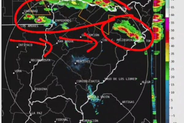 Tiempo de lectura aprox: 11 segundosSe observa en el radar áreas con formación y desarrollo de tormentas. Hacia Empedrado y Santo Tomé se aproximan nubes con gran desarrollo vertical, gran actividad eléctrica y con granizo en su estructura. No sé descarta granizo en superficie y lluvia intensa por cortos períodos. Sentido de avance desde oeste a este. Imagen radar INTA Mercedes.