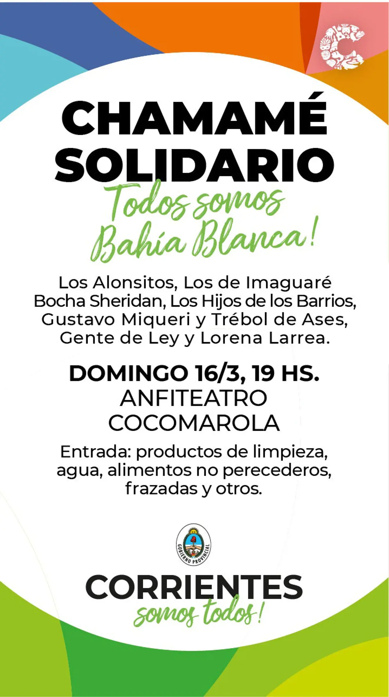 El Anfiteatro Mario del Tránsito Cocomarola será el epicentro de una convocatoria que pretende “devolver a los bonaerenses” todo el apoyo recibido por los correntinos durante catástrofes como los incendios e inundaciones. Se trata de “Chamamé Solidario”, con la actuación de los más destacados referentes del chamamé y el requisito- a modo de entrada – de aportar enseres necesarios para los afectados por el temporal en Bahía Blanca.