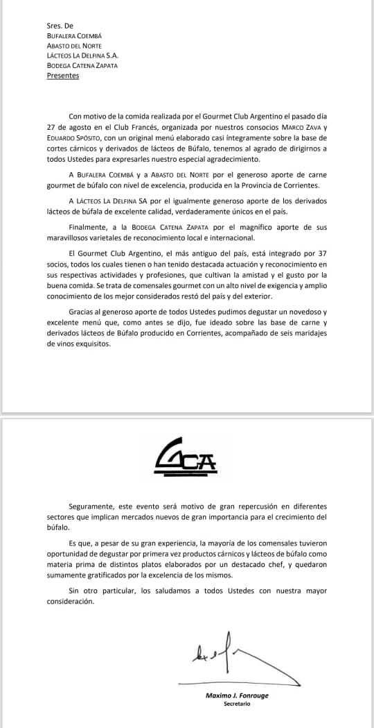 Los organizadores del evento, Marcos Zava y Eduardo Spósito, socios del Gourmet Club Argentino, mediante nota firmada por el secretario del mismo, Máximo Founroge, expresaron su agradecimiento a “Bufalera Coembá y Abasto del Norte por el generoso aporte de carne gourmet de búfalo con nivel de excelencia, producida en la provincia de Corrientes” y a “La Lácteos La Delfina SA por el igualmente generoso aporte de los derivados lácteos de búfala de excelente calidad, verdaderamente únicos en el país”.
