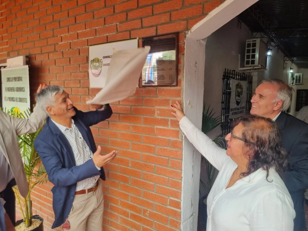 El ministro de Producción Ing P. A. Claudio Anselmo acompañó al presidente del Consejo Profesional de Ingenieros Agrónomos de Corrientes (CPIAC), Ing. Agr. Julio Bartra y a la Comisión Directiva a la inauguración de la nueva sede ubicada en el Barrio Nuestra Señora de la Pompeya, donde descubrieron una placa.