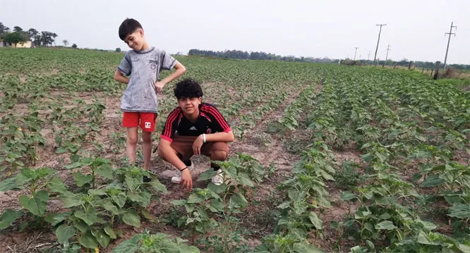 IMAGEN DE PORTADA: Dos niños observan un lote de girasol en la zona sur de Presidencia Roque Sáenz Peña, mientras escuchan la explicación sobre el crecimiento, desarrollo, cosecha y posterior producción de aceite de girasol.