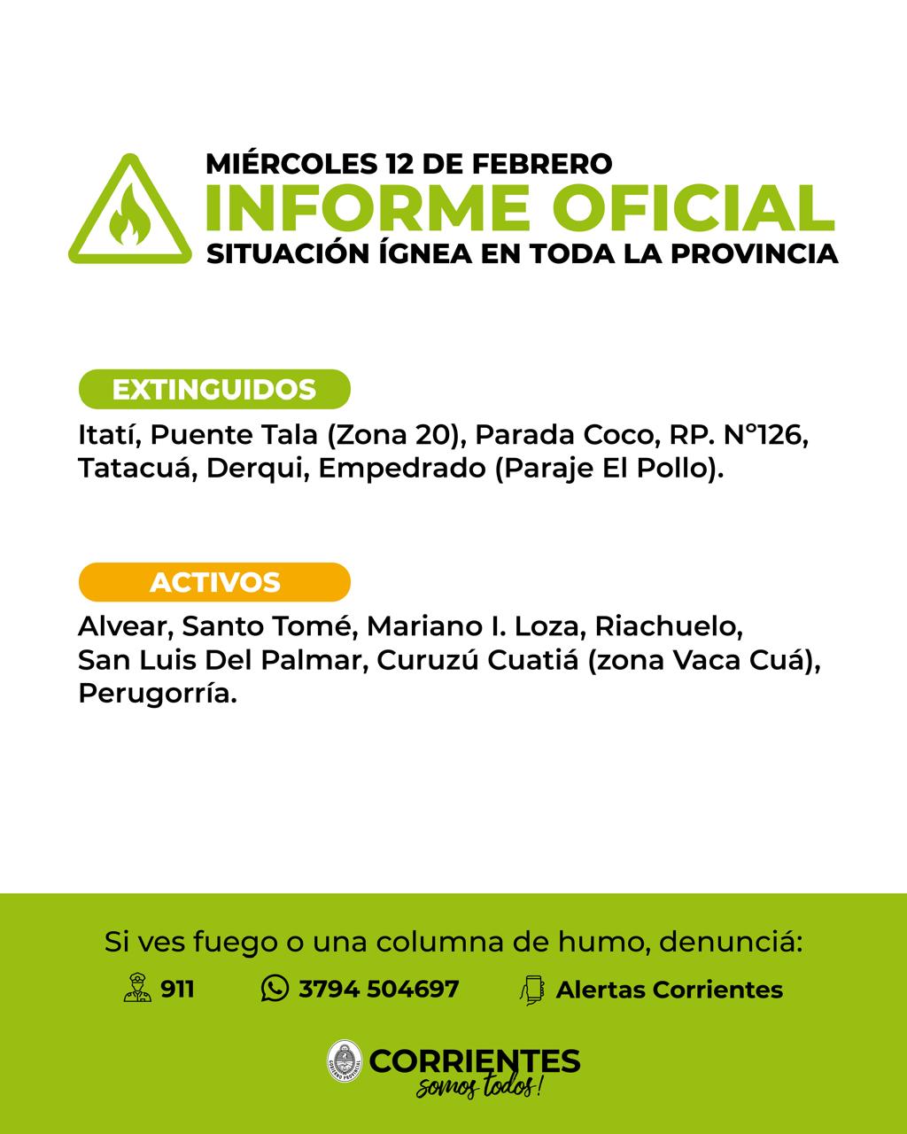 El informe oficial del Gobierno de Corrientes sobre la situación ígnea en la Provincia da cuenta este miércoles que en la jornada se registraron 14 incendios: 7 ya extinguidos y otros 7 todavía activos a las 20 horas. Los extinguidos tuvieron lugar en Itatí, Puente Tala (Zona 20), Parada Coco, Ruta Provincial (RP) N°126, Tatá Cuá, Derqui y Empedrado (Paraje El Pollo).