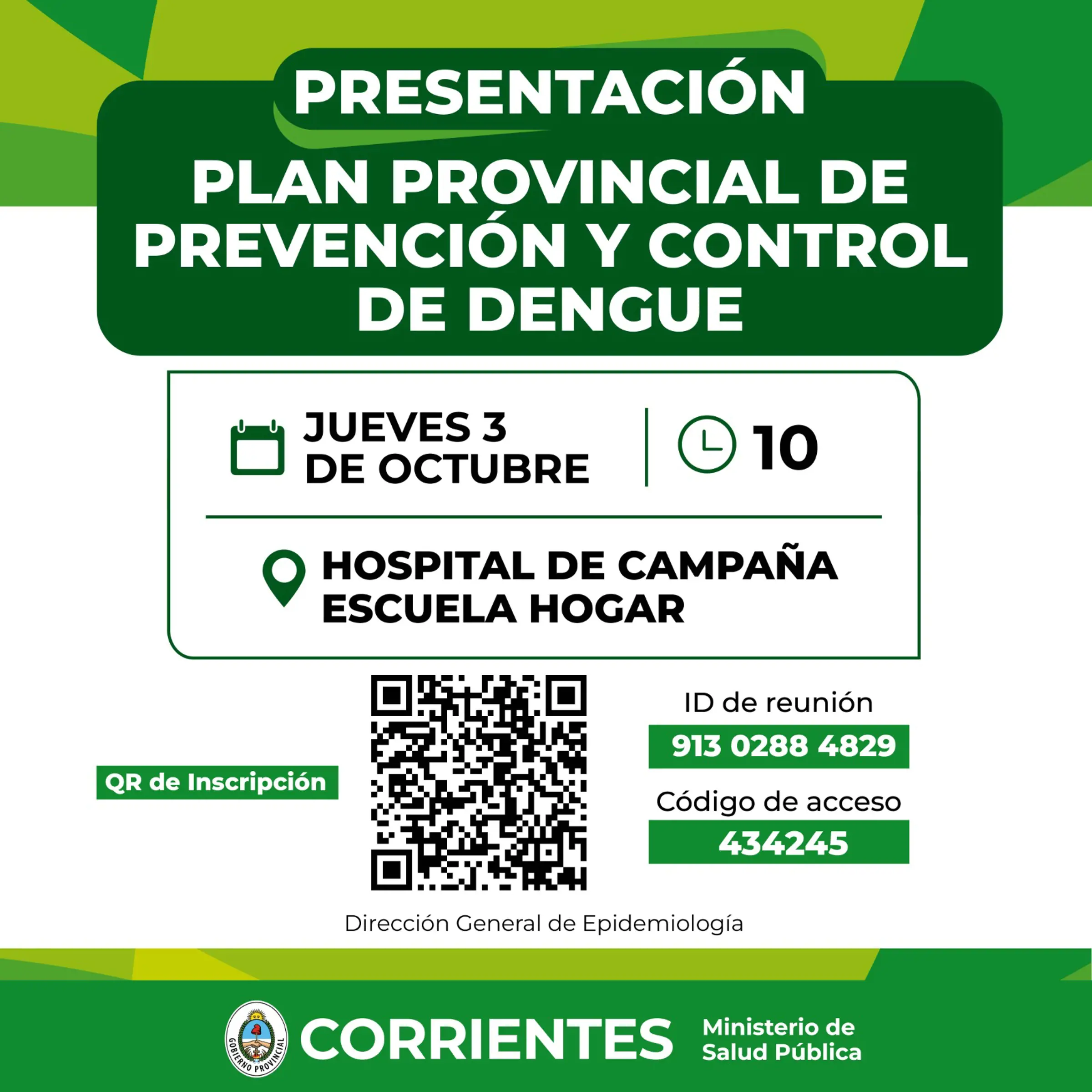 Este jueves a las10, el Ministerio de Salud Pública presentará el Plan Provincial de Prevención y Control de Dengue. El acto, será en el Salón Auditorio del hospital de Campaña Escuela Hogar.
