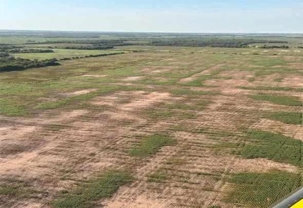 Schlak además es polito de avión y ha compartido con Agroperfiles imágenes de como están los lotes de diferentes cultivos en la zona, y obviamente, los resultados son para el espanto: literalmente, el sol quemó todas las expectativas y esperanzas de tener una campaña como se pintaba en diciembre del año pasado y los primeros cinco días de enero de 2025. Luego vinieron las olas de calor.
