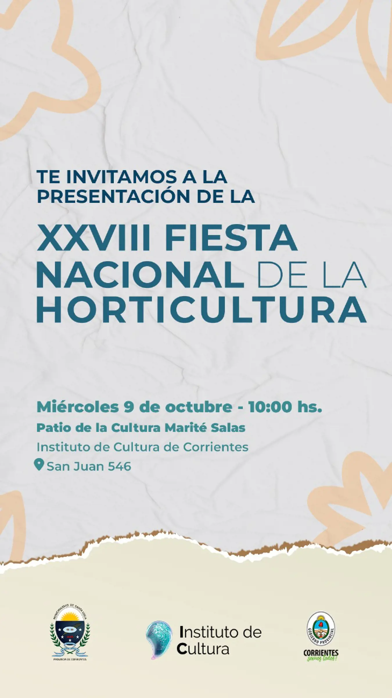 Este miércoles 9 de octubre, a las 10, en el Patio de la Cultura Marité Salas del Instituto de Cultura de Corrientes (San Juan 546) se presentará la Fiesta Nacional de la Horticultura y la grilla de artistas que formará parte de esta celebración, a desarrollarse del 17 al 20 de octubre en la localidad de Santa Lucía.