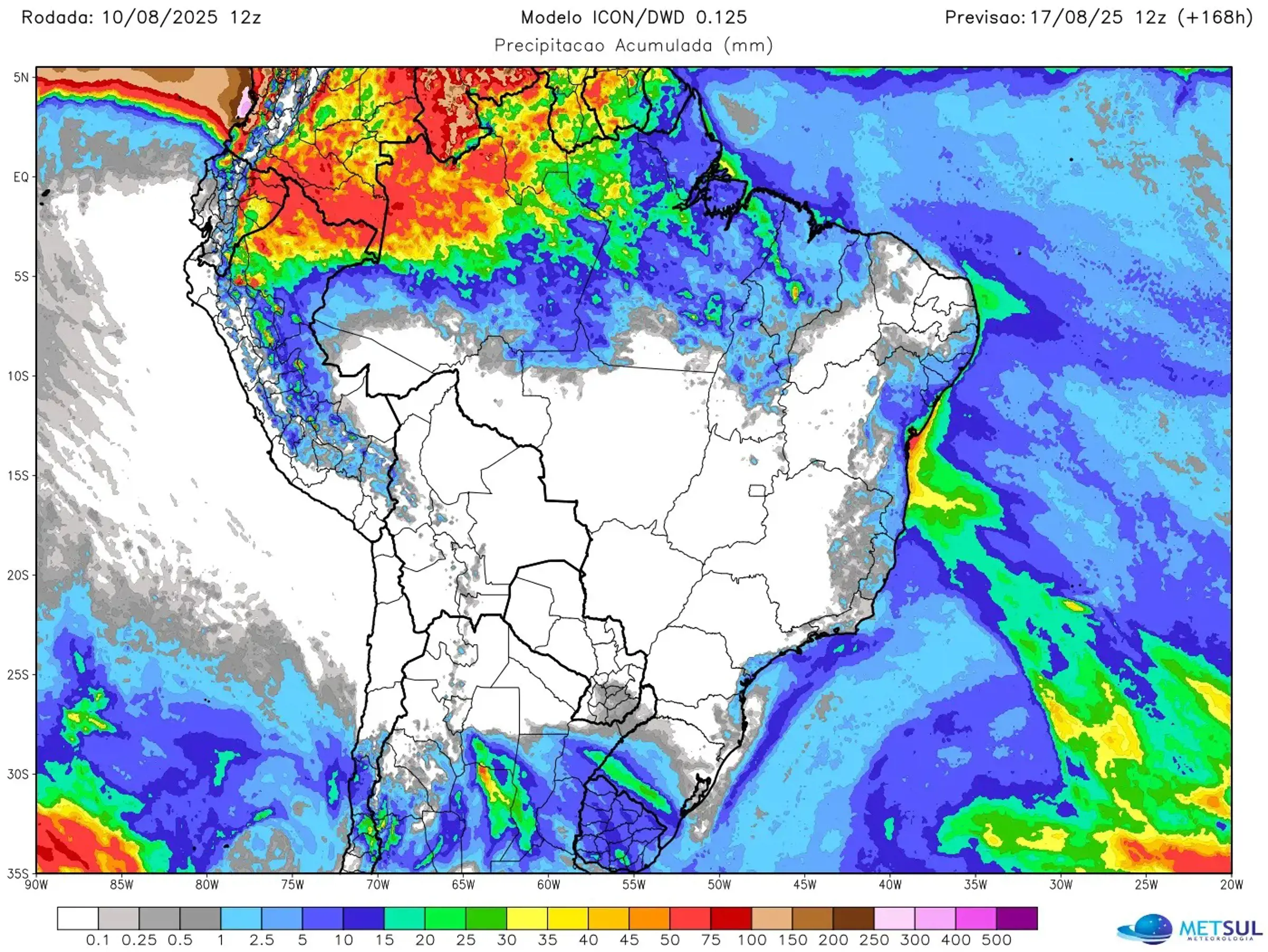 Pronóstico de lluvias acumuladas para Sudamérica entre el 10 y el 17 de agosto de 2025. Modelo ICON/DWD (Alemán).