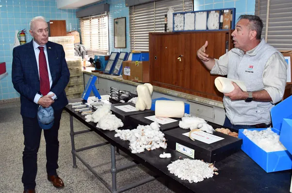 El diplomático se mostró “muy interesado en las temáticas referidas a la investigación científica del cultivo y, junto con su comitiva, recorrió la desmotadora, el laboratorio de fibra y el sector de mejoramiento genético de nuestra Estación Experimental, prestándole especial atención a las explicaciones que los técnicos le hacían en cada sector”, indicó Montenegro.