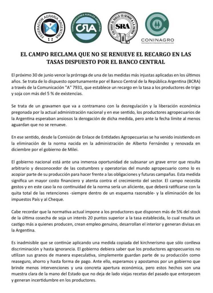 “El próximo 30 de junio vence la prórroga de una de las medidas más injustas aplicadas en los últimos años. Se trata de lo dispuesto oportunamente por el Banco Central de la República Argentina (BCRA) a través de la Comunicación «A» 7931, que establece un recargo en la tasa a los productores de trigo y soja con más del 5 % de existencias”, expresa el comunicado firmado por Federación Agraria, la Sociedad Rural Argentina, Coninagro y la CRA.