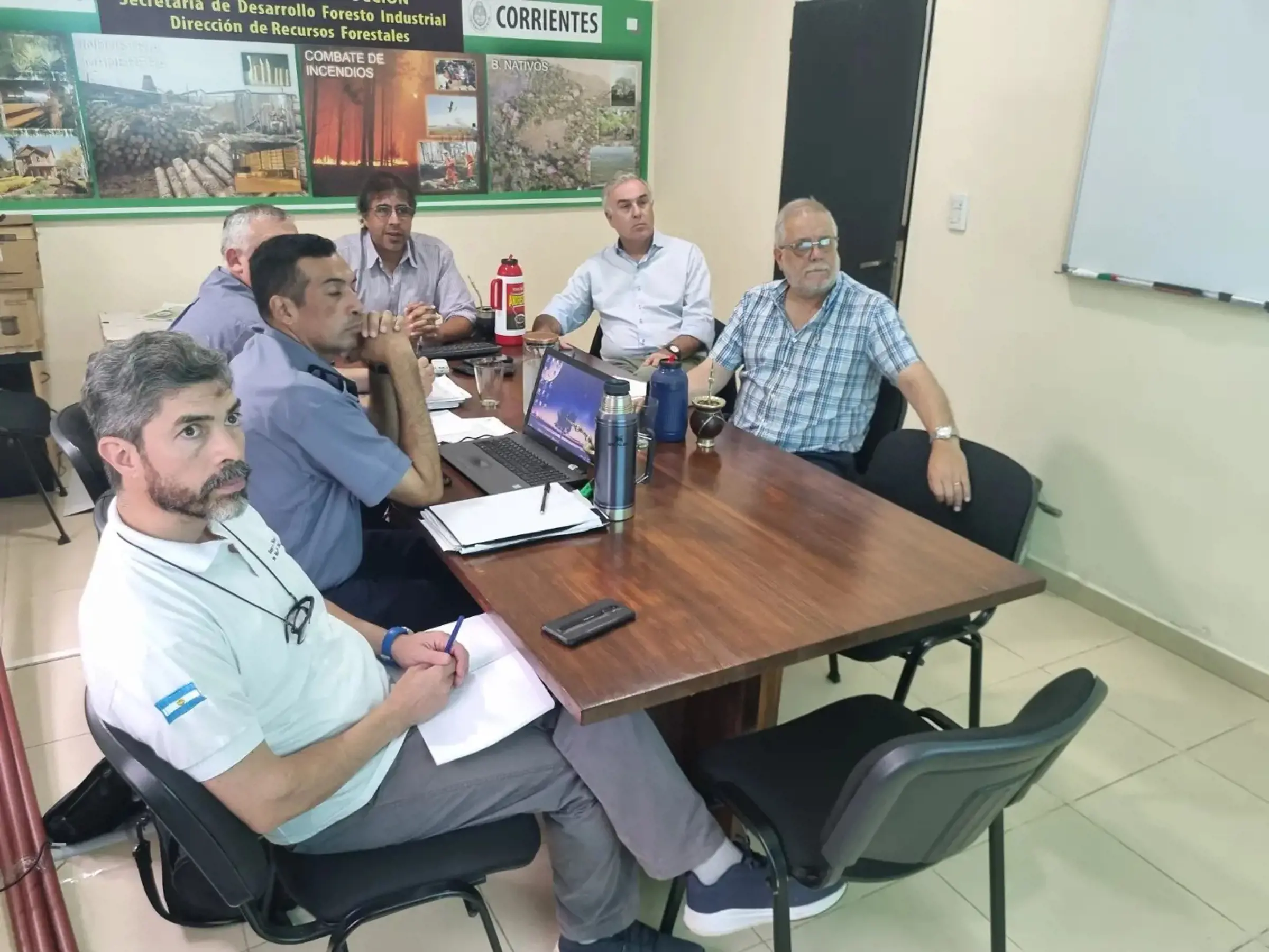El ministro de Producción Ing. Claudio Anselmo junto al secretario de Desarrollo Foresto Industrial Ing. Ftal. Luis Mestres y el director de Recursos Forestales Ing. Ftal. Roberto Rojas lideraron la reunión presencial y virtual del Consejo Provincial de Manejo del Fuego.