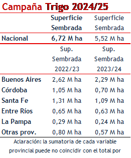 De todos modos, es solo una foto levemente negativa dentro de una película muy positiva: estos 6,72 millones de hectáreas son 1,2 millones o 22% más que los 5,52 millones del año pasado, una de las peores superficies de los últimos años, producto de las condiciones de sequía que quedaron tras la catastrófica campaña 2022/23 afectada por La Niña.